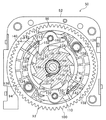 スプリングハウジング172はギヤボックス52に一体的に連結されている。透孔164を通過した小径軸部166はスプリングハウジング172の内側に入り込んで、スプリングハウジング172内に形成された図示しない軸受け部に回転自在に支持されている。また、スプリングハウジング172には図示しない渦巻きばねが収容されている。この渦巻きばねの渦巻き方向外側の端部はスプリングハウジング172に直接又は間接的に係止され、渦巻き方向内側の端部がスプリングハウジング172に入り込んだ小径軸部166に直接又は間接的に係止されている。