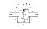 尚、この第一の口3aは常時開口しているので、雨水が貯溜された状態では、第一の口3aから蚊等の虫が発生する心配もある。そのような虫の発生を抑制するため、この第一の口3aにフィルターや、図6に示す圧力開放弁3eを設けてもよい。この図6に示す圧力開放弁3eは、第一の口3aの内面に内挿されたヒンジ式の開放蓋であって、通常は閉じられていて、排水管2内部の圧力が高まる(水位が上昇する)と開くようになっているものである。このような圧力開放弁3eを設けることで、通常時は排水管2内部と外部の接触が遮断されるため、虫の発生を抑制することができる。この圧力開放弁3eは、本実施形態のように、内挿しではなく、外挿タイプのものでもよく、外挿タイプの圧力開放弁3eは、第一の口3a開口面積が小さくならないというメリットがある。