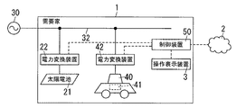 電力変換装置42は、電力変換装置22と同様に、電力系統30との系統連系が可能になっている。電力変換装置42は、直流と交流との間で双方向に電力を変換する機能を有し、電力系統30または電力変換装置22から出力された交流電力を直流電力に変換して蓄電池41を充電し、蓄電池41の直流電力を交流電力に変換して電気負荷31に供給する。なお、電動車両40に接続された電力変換装置42から電力系統30に電力の逆潮流を行うことは、禁止する場合と許容する場合とがあるが、ここではとくに問わない。