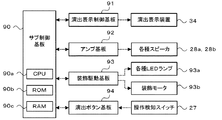 サブ制御基板90は、図12に示すように、CPU90aやROM90b,RAM90cなどを備えており、主制御基板70から各種指令信号を受信してその指令に応じた遊技の演出を行う。サブ制御基板90は、演出表示装置34の制御を行う演出表示制御基板91や各種スピーカ28a,28bを駆動するアンプ基板92、各種LEDランプ93aを駆動したり可動演出役物を動作させるための装飾モータ93bを駆動したりする装飾駆動基板93,演出ボタン26に設けられ演出ボタン26の操作を検知する操作検知スイッチ27からの操作信号を入力する演出ボタン基板94などが接続されている。