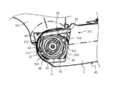 次に、本発明にかかるヘアードライヤの要部であるヒンジ部3の詳細について図面を参照して説明する。図5は本発明にかかるヘアードライヤの右ハンドルカバーを取り外した状態を示す図であり、図6は本発明にかかるヘアードライヤの右ハンドルカバーを示す図であり、図7は本発明にかかるヘアードライヤの節度部の分解斜視図である。また、図8は本発明にかかるヘアードライヤのハンドルが使用位置にあるときの節度部を示す部分断面図であり、図9は本発明にかかるヘアードライヤのハンドルが収納位置にあるときの節度部を示す部分断面図である。また、図10は本発明にかかるヘアードライヤの左ハンドルカバーを取り外した状態を示す図であり、図11は本発明にかかるヘアードライヤの左ハンドルカバーを示す図である。