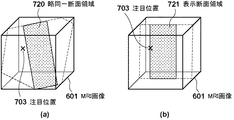 ステップS3090において、画像処理装置100は、断面画像生成部120の処理として、ステップS3080で算出した表示断面領域721をMRI画像601から切り出した断面画像722(伏臥位断面画像)を生成する。また、MRI画像601を変形規則に基づいて仰臥位に変形させた仮想的な仰臥位MRI画像を生成し、撮影断面領域502と同一の断面領域を切り出した画像(仰臥位断面画像)を生成する。ここで、指定した平面の所定の範囲の画像を3次元画像から切り出して生成する方法については周知であるので、その詳細に関する説明は省略する。なお、表示断面領域721の断面画像と略同一断面領域720の断面画像の何れの断面画像を伏臥位断面画像として生成するかを、不図示のUIにより操作者が随時選択できる構成であってもよい。この場合、本ステップでは、選択されている断面領域(表示断面領域721または略同一断面領域720)に対応する断面画像を伏臥位断面画像として生成する。