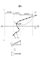 図3は、ナビゲーション装置100で検知された自車位置に基づく車両の移動軌跡(走行軌跡)の一例を示した図である。図3(a)および(b)は各々、立体駐車場303の位置や退出方向が異なる場合の走行軌跡の一例を示したものである。車両が立体駐車場303に入庫すると、GPS受信装置23がGPS衛星からの信号を受信できなくなるため、自車状態検知部202は、車速センサ21およびジャイロセンサ22から出力される情報などを用いて自立航法により自車位置および車両方位を算出する。このとき、車両は立体駐車場内303を傾斜旋回走行するため、自車状態検知部202により算出される車両方位には比較的大きな誤差が生じる。このような状態で車両が走行を続けると、方位誤差による位置誤差が蓄積される。そのため、ナビゲーション装置100は、正しい走行軌跡301とは違う誤差の大きい走行軌跡302を求めてしまう。