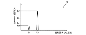 これらのピーク値Pa,Pbは、送受信面31から反射面までの距離が短いほど大きくなり、反射面の面積が広いほど大きくなる。反射面までの距離に関しては、当接面25までの距離Laが凹面26までの距離Lbより短いのであるが、当接面25における送受信面31との対応面積は、凹面26における送受信面31との対応面積よりも小さい。その結果、当接面25における反射波のピーク値Paは、凹面26における反射波のピーク値Pbよりも小さい。尚、融着突起24の突出端面においては、消波部材20とタンク本体部11とが溶着し、超音波Wは殆ど通過するため、反射波は無視できるほどに弱い。また、非接触領域15は送受信面31と対応していないので、非接触領域15における超音波Wの反射波は発生しない。
