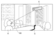 同図に示すように、本実施形態では、ユーザが頭部にシースルー眼鏡型のHMD(Head Mount Display)100を装着することで、AR環境が実現される。ユーザは、HMD100のレンズ(表示部)を通して実環境を視認しながら、当該実環境における道路、建物、看板等に重畳して仮想的に表示されるコンテンツCを視認することができる。