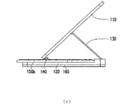 図1(a)の状態において、使用者は、例えば、タッチ方式で携帯型電子デバイス50を操作することができる。使用者が入力インターフェースをキーボードに変更する必要がある場合、上カバー110をベース120に相対して回動起立させることにより、サブキーボード150aとサブキーボード150bを連動させて、完全なキーボード150に組み立てることができる(図3(a)に示す)。本実施形態において、スライドアセンブリ140は、上カバー110、サブキーボード150aおよびサブキーボード150bを連接しているため、上カバー110、サブキーボード150aおよびサブキーボード150bは、連動関係を有する。具体的に説明すると、上カバー110がベース120に相対して閉じられている状態(図1(a)に示す)から、スライドアセンブリ140を介してベース120に相対して回動起立する状態に変更した時、上カバー110は、スライドアセンブリ140をベース120のシュート122に相対してスライドさせ、同時に、サブキーボード150aとサブキーボード150bを連動させて、それぞれL型ガイド溝124aおよびL型ガイド溝124bにスライドさせるため、完全なキーボード150に組み立てられる(図3(a)に示す)。注意すべきこととして、上カバー110がベース120に相対して回動起立する過程において、支持部材130は、上カバー110を支持して、上カバー110を安定して起立させるため、上カバー110が携帯型電子デバイス50を収納した後に重すぎて倒れるのを防ぐことができる。