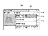 図6は、本発明の実施形態における表示画面スキャンモードの読み取り条件の設定選択画面を示す図である。制御部50は、図6に示すように、表示部32aに、初期値に設定された表示画面スキャンモードの読み取り条件を個別に変更するためのボタン101a〜101cを表示させる。本実施形態では、ボタン101aが「原稿サイズの選択」であり、ボタン101bが「カラーの設定」であり、ボタン101cが「解像度の設定」のボタンとなっている。「原稿サイズの選択」では、端末装置Sの表示画面に応じた読取範囲を設定することができる。「カラーの設定」では、読取画像のデータをフルカラー、グレースケール、モノクロに設定することができる。「解像度の設定」では、初期設定された解像度600dpiを任意の値に設定することができる。ユーザーは、必要に応じてボタン101a〜101cを操作し、読み取り条件を選択または変更する(ステップS8)。なお、本実施形態では、上述したように、表示画面スキャンモードでは露光ランプ22aが消灯された状態で読み取られる。そのため、図6における前記設定選択画面では、表示画面スキャンモード時の露光の設定はできず、露光の設定は初期設定のままとなる。つまり、露光の設定は、「消灯」に設定された状態から変更することはできない。