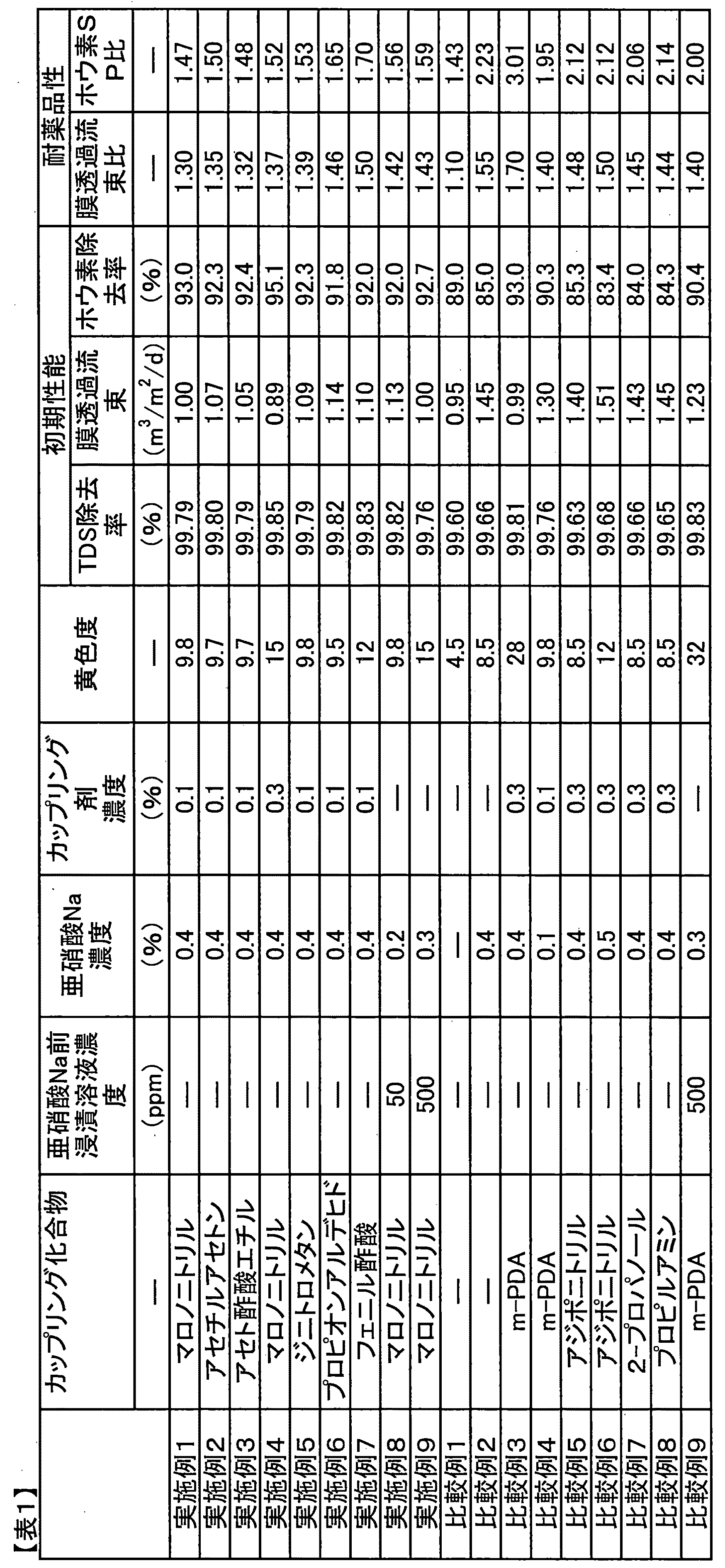 参考例1で得られた複合半透膜を、pH3.0、35℃に調整した、亜硝酸ナトリウム0.4重量%水溶液に40秒間浸漬した。亜硝酸ナトリウム水溶液のpHの調整は硫酸を用いて行った。次に、この複合半透膜を30℃のマロノニトリル0.1重量%水溶液に20秒間浸漬し、ジアゾカップリング反応を行った。複合半透膜をマロノニトリル水溶液から取り出した後、35℃の0.1重量%の亜硫酸ナトリウム水溶液に2分間浸漬した。このようにして得られた複合半透膜を評価したところ、TDS除去率、膜透過流束、ホウ素除去率はそれぞれ表1に示す値であった。また、複合半透膜の耐薬品性を評価したところ、薬品接触前後での膜透過流束比、ホウ素SP比は表1に示す通りであった。