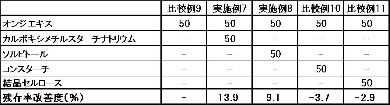 保存後の固形組成物について、それぞれ組成物中の3’,6-di-O-sinapoyl-sucrose ester含有量を測定し、直後品中の3’,6-di-O-sinapoyl-sucrose ester量に対する残存率を(%)求め、比較例5における3’,6-di-O-sinapoyl-sucrose ester残存率との差を、各組成物における残存率改善度(%)とした。
