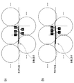 LED等の発光素子を用いた固体走査系の露光デバイスは、発光素子を列状に並べた発光素子アレイと、ロッドレンズやその他のレンズ等を列状に並べたレンズアレイとから構成される。このような露光デバイスでは、並べられた発光素子とレンズとの位置関係に依存して照射光量(感光体表面が受光する光量)の変化が生じる。そのため、レンズの半径(或いはその整数倍)周期の濃度ムラが生じてしまう。例えば、図3(a)及び図3(b)は、発光素子にLED、レンズにロッドレンズを用いた場合の、発光素子アレイとレンズアレイとの位置関係を表す模式図である。図3(a)及び図3(b)では、一列に並べられたLEDを夫々斜線入りの長方形で示し、ロッドレンズアレイの各ロッドレンズを白丸で描いてある。具体的には、半径200μm程度のロッドレンズが2段に重なりつつ並べられ、その中央に1200dpiピッチ即ち21.1μmピッチでLEDが並べられた配置関係を図示している。各LEDはロッドレンズアレイに対する位置関係が異なり、ロッドレンズのどの箇所をLEDからの光が通過するかに依存して光量損失等が異なることから、並べられたLEDとロッドレンズとの位置関係に依存して照射光量の変化が生じる。 An exposure device of a solid scanning system using light emitting elements such as LEDs is composed of a light emitting element array in which light emitting elements are arranged in a row and a lens array in which rod lenses and other lenses are arranged in a row. In such an exposure device, the amount of irradiation light (the amount of light received by the surface of the photoreceptor) varies depending on the positional relationship between the arranged light emitting elements and the lens. For this reason, density unevenness occurs with a period of the radius of the lens (or an integer multiple thereof). For example, FIGS. 3A and 3B are schematic diagrams showing the positional relationship between the light emitting element array and the lens array when an LED is used as the light emitting element and a rod lens is used as the lens. In FIG. 3A and FIG. 3B, the LEDs arranged in a row are indicated by hatched rectangles, and each rod lens of the rod lens array is drawn by a white circle. More specifically, the arrangement relationship is shown in which rod lenses having a radius of about 200 μm are arranged in two stages, and LEDs are arranged at the center at a 1200 dpi pitch, that is, 21.1 μm pitch. Each LED has a different positional relationship with the rod lens array, and the amount of light loss etc. varies depending on which part of the rod lens the light from the LED passes through. Depending on this, the amount of irradiation light changes.