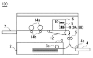 インクジェットプリンタ100は、外部機器(例えば、パーソナルコンピュータ)に接続されている。インクジェットプリンタ100は、外部機器から印刷要求があると、給紙部2にセットされた給紙トレイ(給紙バンク)3又は手差しトレイ4に収納した記録用紙を給紙ローラ3a又は4aにより1枚ずつ分離して上方に搬送する。
