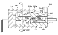 傾斜面141aは、図18に示すように、一側となる先端部141sから他側となる基端部141t側に向かって、図12および図18に示すように押圧部113bによる押圧方向F2(第1接触部141の移動方向)と直交する方向における第1検知用端子221との距離が長くなるように傾斜している。