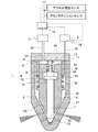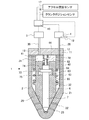 ノズル部2は、プレート11およびノズルボディ21を備えている。ノズルボディ21は、プレート11側の一端が開口し、他端が閉じている円筒形状の部材であり、この中には、アウタニードル6、インナニードル7、シリンダ42、アウタスプリング43、およびインナスプリング44が備わる。ノズルボディ21の上端部には、プレート11が図示しないリテーニングナット等で固定されている。