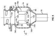 図4は、本開示の一実施形態に係る給油ライン70の軸方向断面図を示している。給油ライン70は、拡張固定室74に接続するノズル入口72を有してもよい。拡張固定室74は、燃料供給管76に更に接続する。ノズル入口72は、ノズル通路80を画定する外周壁78を有する。固定室74は、外壁78に一体に接続する外壁82を有する。固定室74の外壁82は、MFIが固定されるように構成されている内部空間84を画定する。燃料供給管76は、外壁82に一体に接続する外壁86を有する。燃料供給管76の外壁86は、燃料供給路88を画定する。
