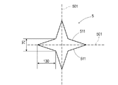本例の移動体システム10では、誘導マーカ5の形状に技術的な特徴のひとつがある。誘導マーカ5は、図4のように、上下左右に向けて鋭角に突出する4箇所のテーパー形状(くさび形状)を有し全体として十字型の形状を呈している。4箇所のテーパー形状は全て同じ形状をなし、誘導マーカ5は、十字に直交する中心線501を介して上下左右に線対称の形状となっている。各テーパー形状の大きさは根元側の幅が70mm、突出長さが130mmであり、誘導マーカ5全体では、直径330mmの円に内接する大きさとなっている。
