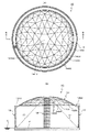 従来、床面の周囲から起立する周壁の上端で囲まれた開口を閉塞するように、ドーム状の屋根構造体を構築するにあたっては、周壁の内側の床面上に屋根構造体の全域に対応する多数の足場を設置し、作業員が足場上で高所作業を行なう必要がある。