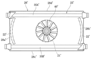 詳しくは、ヒータケース26は、高さHが幅Wより短い横長の概ね長方形状に形成されている。コンベクションヒータ35A,35Bは、吸込口21と吹出口22,22の間に幅方向Hに延びるように配置されている。これらコンベクションヒータ35A,35Bは、側部28bから側部28aに向けて左上がりに配置されており、水平方向である幅方向Wに対して傾斜し、垂直方向である高さ方向Wに対しても傾斜している。