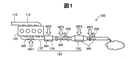 図1は、ガスセンサの被水試験を行う試験装置100の構成を示す説明図である。この試験装置100は、実際の自動車を用いた試験装置であり、内燃機関であるエンジン150と、吸気管110と、排気管120とを有する。なお、試験装置としては、エンジン、吸気管、排気管等を有するエンジンベンチシステムを用いても良い。吸気管110は吸気マニホールド112を有し、排気管120は排気マニホールド122を有する。排気管120には、更に、ターボチャージャ124と、触媒コンバータ126と、複数のガスセンサ200とが設けられている。排気管120には、水分を排気管120内に注入するために複数の注入位置WP1〜WP5が設けられている。これらの注入位置WP1〜WP5からの水分の注入方法については後述する。なお、水分の注入位置を複数設ける必要は無く、1つ以上設けておけば良い。複数のガスセンサ200としては、通常は異なる種類のガスセンサ(例えばA/Fセンサと酸素センサ)が排気管120に設置されるが、ここでは説明の便宜上、同じ符号を付している。また、ターボチャージャ124や触媒コンバータ126などの付属装置は、省略してもよい。