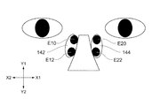 図4に示す例では、アイウエア100の装着時のノーズパッド142及び144が示される。図4に示すように、例えば、右ノーズパッド142の表面に、上端部の第1電極E10、下端部の第2電極E12が設けられ、左ノーズパッド144の表面に、上端部の第3電極E20、下端部の第4電極E22が設けられる。