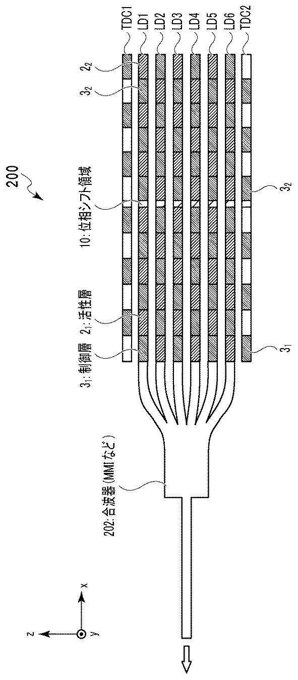 図2を参照して、本実施形態に係る半導体レーザアレイ(TDA-DFBレーザアレイ)200の構造及び制御方法について説明する。図2は、TDA-DFBレーザアレイの上面模式図である。TDA-DFBレーザアレイ200は、同一基板上に発振波長の異なる6個のTDA-DFBレーザ(LD1〜LD6)が、光の伝搬方向に垂直な方向(z方向)に一定の間隔(光のフィールドが重ならない程度の間隔)で並列に配置され、その出力光は合波器(例えばMMIカプラなど)202で合波された後、出力される。合波器202と各LDの出射端との間に光出力を増幅するために半導体光増幅器(Semiconductor Optical Amplifier:SOA)(不図示)を集積しても良い。TDA-DFBレーザアレイ200を構成する複数のTDA-DFBレーザは、同一基板上に2次元的または3次元的に配列される。