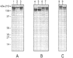 親和性ドメインとしては、例えば、同定または精製に有用な、固体の担体に固定化されたもの等の、結合パートナーと相互作用できるペプチド配列が挙げられる。複数の連続するヒスチジン等の単一のアミノ酸をコードするDNA配列は、発現たんぱく質への融合時、ニッケルセファロース等の樹脂カラムへの高親和性結合による該組み換えタンパク質の一段階精製に用いられうる。典型的な親和性ドメインとしては、His5(HHHHH)(SEQ ID NO:26)、HisX6(HHHHHH)(SEQ ID NO:27)、C−myc(EQKLISEEDL)(SEQ ID NO:25)、Flag(DYKDDDDK)(SEQ ID NO:24)、StrepTag(WSHPQFEK)(SEQ ID NO:28)、ヘマグルチニン、例えば、HA Tag(YPYDVPDYA)(SEQ ID NO:23)、グルタチオン‐S‐トランスフェラーゼ(GST)、チオレドキシン、セルロース結合ドメイン、RYIRS(SEQ ID NO:30)、Phe−His−His−Thr(SEQ ID NO:31)、キチン結合ドメイン、S‐ペプチド、T7ペプチド、SH2ドメイン、C末端RNAタグ、