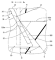 またここで図2に示すように、回転本体31が検出固定体10の固定軸受101によって軸受されている検出回転体30には、それら要素31,101間の軸受ガタに起因して、軸受中心線Cに対する傾斜が不可避的に許容されている。さらに、回転ストッパ51を形成しているアーム33の装着部330が回転本体31に装着されてなる検出回転体30には、それら要素330,31間の装着ガタに起因して、軸受中心線Cに対する傾斜が不可避的に許容されている。そこで、こうした軸受ガタ及び装着ガタ等に起因して検出回転体30に許容されている傾斜のうち、軸受中心線Cに対して特定回転側Rsとは逆側Rrへの傾斜角度が図5の如く最大値θとなる傾斜を想定し、それを最大傾斜角度θとして定義する。かかる定義下にてストッパ面520と重なる仮想傾斜面Sは、図5に示すように、検出回転体30に許容された最大傾斜角度θよりも大きな傾斜角度ψをもって、基準軸線Bから傾斜した姿勢となる。これにより、限界回転位置Plにて回転ストッパ51は、ストッパ面520のうちストッパ端部520aに限定して接触することが、可能となっている。尚、傾斜角度θ,ψについて図5では、それぞれは説明の理解を容易にするために実際よりも大きく図示されているが、大小関係は図示の通りである。   In addition, as shown in FIG. 2, the detection rotating body 30 in which the rotating body 31 is supported by the fixed bearing 101 of the detection fixing body 10 has a bearing center due to the bearing play between the elements 31 and 101. Inclination with respect to the line C is inevitably allowed. Further, the detection rotating body 30 in which the mounting portion 330 of the arm 33 forming the rotation stopper 51 is mounted on the rotating main body 31 has a bearing center line C due to mounting backlash between the elements 330 and 31. Inevitably tolerant to Therefore, among the inclinations allowed for the detection rotating body 30 due to such bearing backlash and mounting backlash, the inclination angle to the side Rr opposite to the specific rotation side Rs with respect to the bearing center line C is shown in FIG. In this way, an inclination having the maximum value θ is assumed and defined as the maximum inclination angle θ. Under such a definition, the virtual inclined surface S overlapping the stopper surface 520 is inclined from the reference axis B with an inclination angle ψ larger than the maximum inclination angle θ allowed for the detection rotating body 30, as shown in FIG. It becomes. Thereby, the rotation stopper 51 can be limited to the stopper end portion 520a in the stopper surface 520 at the limit rotation position Pl. In FIG. 5, the inclination angles θ and ψ are each shown larger than the actual one for easy understanding of the explanation, but the magnitude relationship is as shown.