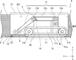 まず、搬送機構11の構成について説明する。搬送機構11は、クーラントタンク清掃装置1が、クーラントタンク内を前後左右の任意の方向への移動を可能にする。搬送機構11は、例えば、クローラや車輪などである。本実施の形態では、クローラを用いている。