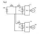 図9に示す第3実施形態では、4つのインバータ装置211〜214と、4つの電動モータ301〜304を備える。第3インバータ装置213には、第3平滑コンデンサC3が接続され、第4インバータ装置214には、第4平滑コンデンサC4が接続されている。図9のLbは、直流電源200から、2つのインバータ装置213、214の分岐点N2までの配線インダクタであり、L3は、分岐点N2から第3インバータ装置213までの配線インダクタであり、L4は、分岐点N2から第4インバータ装置214までの配線インダクタである。