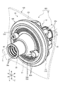 第1隔壁部11、第2隔壁部12は、それぞれ中心軸線Cが軸線方向Xに沿った円環板状に形成される。第1隔壁部11と第2隔壁部12とは、軸線方向Xに沿って空間をあけて対向し外周部10Aで一体化されている。ここで、外周部10Aとは、第1隔壁部11、第2隔壁部12において径方向(中心軸線Cと直交する方向)の外側に位置する端部である。第1隔壁部11と第2隔壁部12とは、少なくとも一方(ここでは第2隔壁部12)が軸線方向Xに沿って外側に膨出した形状に形成される。第1隔壁部11と第2隔壁部12とは、外周部10Aで一体化された状態で、全体として内部が中空のドーム状に形成される。第1隔壁部11は、軸線方向Xの第2隔壁部12側とは反対側の面に筒状部20が接続される。第2隔壁部12は、軸線方向Xの第1隔壁部11側とは反対側の面に筒状部30が接続される。なお、第1隔壁部11、第2隔壁部12は、種々のリブ、突起部、孔部等も形成されている。