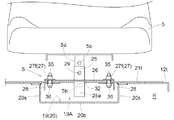 左右の前ガイド軸27fは、図5,6,9に示されるように、操作ハンドル35を有するネジ軸によって構成されている。前ガイド軸27fがケース天板部21tの内側に設けられたネジ部材36(図6参照)に締込み操作されることにより、板体26が前ガイド軸27fによってケース天板部21tに締め付け固定され、左右の前ガイド軸27fが緩め操作されると、ケース天板部21tに対する板体26の締め付け固定が解除される。