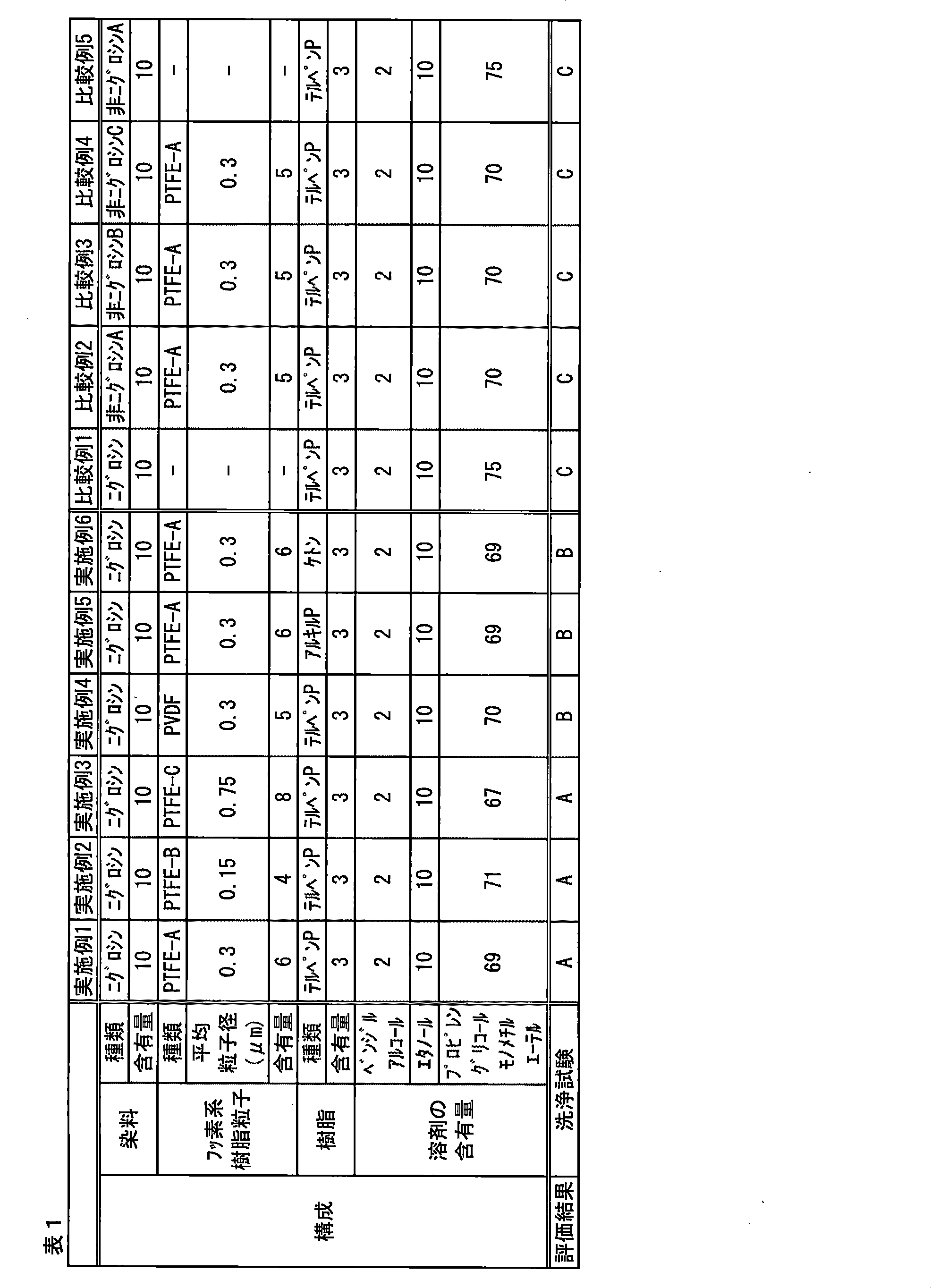 これに対し、フッ素系樹脂粒子を含有していない比較例1、ニグロシン染料を含有していない比較例2〜4、並びにフッ素系樹脂粒子及びニグロシン染料をいずれも含有していない比較例5の筆記具用油性インク組成物によって得られた描線は、食器洗浄機による洗浄に耐えることができなかった。 On the other hand, the writing instruments of Comparative Example 1 which does not contain the fluorine-based resin particles, Comparative Examples 2 to 4 which do not contain the niglosin dye, and Comparative Example 5 which does not contain any of the fluorine-based resin particles and the niglosin dye. The lines obtained with the oil-based ink composition could not withstand washing with a dishwasher.