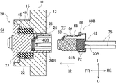図2に示すように、ケーブルコネクタ60Bは、信号ケーブルコネクタであり、前後方向に延在する略角筒状のハウジング61Bを備えている。ハウジング61Bの前端には複数の端子挿入口(不図示)が形成されており、ハウジング61Bの後端には矩形状の開口62が形成されている。ハウジング61Bの内部には、各ケーブル75に結線された雌型端子76が開口62を通じて収容される。複数の雌型端子76は、ハウジング61Bの内部においてハウジング61Bの先端側に保持されている。各雌型端子76の先端面は、ハウジング61Bの端子挿入口から外部に露出されている。