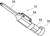図5A及び図5Bに示すように、雄型端子51は、銅合金等の導電性材料によって形成されており、基端側から先端側に向かって筒状の外皮カシメ部52、筒状の芯線カシメ部53、ボックス状の中間部54、ピン状の接触部55を連ねて形成されている。ケーブル50の外皮が外皮カシメ部52にかしめられ、ケーブル50の外皮から突出した芯線が芯線カシメ部53にかしめられることで、雄型端子51がケーブル50(図4B参照)に接続される。中間部54は、ケース部22の端子収容空間34(図4B参照)に収容される部分であり、中間部54の一側面には、後述するランス35に係止されるランス穴56が形成されている。
