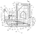 灰受け部43は、移動可能に設けられた揺動板431と、この揺動板431の下面に当接させると共に燃焼室4に対し固定して設けられた固定板432と、揺動板431を揺動駆動させる揺動モータ433を有している。さらに、灰受け部43は、溝部材44と、排出スクリュ45を備えていて、火格子41から移動してきた灰を燃焼室4外に移送させることができる。