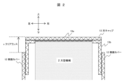 図2に示すように、天キャップ13は、水平部13aと垂直部13bを有している。水平部13aは、大型機械2の上部を保護する保護材でもあるため、クッション性を高めるべく2層構造の厚い段ボールで構成している。また、水平部13aの下面中央に、大型機械2の上部が嵌合する形状の窪みを予め設けることで、天キャップ13の水平方向への摺動を抑制している。一方、大型機械2との接触を予定しない垂直部13bは、1層構造の薄い段ボールで構成しており、側面カバー12の内面と接触するように配置されている。