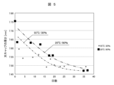 図5は、無負荷時厚さが8mmの2層構造の段ボールに定格負荷625kg/m2(図4の最下段の梱包箱3の天キャップ13に加わる最大負荷に相当)をかけ続けた場合の、段ボール厚さの経時変化の実測値の一例を示すグラフである。なお、図中の一点鎖線は、低湿度の第1環境下(温度55℃、湿度30%)での段ボール厚さの経時変化の近似グラフを示し、二点鎖線は、高湿度の第2環境下(温度20℃、湿度90%)での段ボール厚さの経時変化の近似グラフを示す。