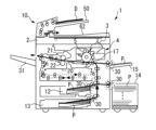 また、12、13はシートとしての用紙Pを500枚ほど収納可能な給送部、14は大容量の用紙Pを収納可能な大容量給送部、15は手差し用の用紙Pをセット可能な手差し給送部、を示す。
