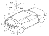 図1の自動車1は、車両の一例である。自動車1は、車室3が画成される車体2を有する。自動車1の車体2には、車室3に対して乗員が乗降するための複数のドアとともに、車室3の後部である荷室にアクセスするためのリアゲート10を有する。リアゲート10は、その上縁部分が一対のヒンジ部材6により、車体2のルーフ部分に取り付けられている。