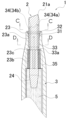 図3に示すように、ペン先2の円柱状の外面23は、大径部23aと、該大径部23aの後方に連設される小径部23bと、大径部23aと小径部23bとの間に形成される外段部23cとを備える。外段部23cが、後述する縦リブの凸部33aに前後方向に当接され、それにより、筆記時及び組立時において、ペン先2の軸筒3内への埋没が防止される。