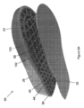 プラットフォーム層40は、中身が詰まっていてよく、又は、それは複数の孔を有してよく、これにより、重量が低減され、付加製造プロセスにおいて使用された粉末又は他の材料などの余材の除去が容易になる。例えば、プラットフォーム層40及び/又は格子38は、ソールアセンブリ14及び/又は履物アセンブリ10の最終組み立ての前に加圧空気又は他の洗浄用媒体がインソール部分24から余材を除去することを可能にするように構成されている(図1B)。例示されている実施形態は、格子38が装着者の足及びプラットフォーム層40の間になるように、プラットフォーム層40から上向きに延びる格子38を有する。それに応じて、プラットフォーム層40がミッドソール部分26上で支持される。以下で論述される他の実施形態において、インソール部分24は、ラス42がプラットフォームから離れてミッドソール部分26に向けて下向き延びるように、プラットフォーム層40が格子38の上方にあるように逆さにされてよい。