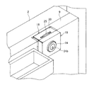 ケース本体18は、一枚の金属板を折り曲げ加工して形成されたものとして示されているが、底壁部材16、側壁部材17a、17b、17c、17dを溶接して形成してもよい。底壁部材16から各側壁部材17a、17b、17c、17dの後端縁までの前後幅は同一で、ケース本体18は、各側壁部材の後端縁が開口された直方体状となっている。ケース本体18のサイズは、裏側カバー押さえ止め具21をケース本体18の底壁部材16側から収納して、裏側カバー押さえ止め具21を前面枠に設けられた支軸を中心に回動することができ、しかも、蓋体19を被せた時に、掛け金25をケース本体18内で錠軸24aを中心に回動させ、ケース本体18の掛合用スリット20、20に掛合させて、蓋体19をロックするのに支障がないように設定されている。側壁部材17a、17cの掛合用スリット20、20は、底壁部材16内側から等距離の位置に形成されており、掛合用スリット20、20の幅は掛け金25の厚さよりも稍大きく、その長さは、蓋体19を被せてシリンダー錠24の掛け金25がケース本体18内で錠軸24aを中心に回動するのに支障がないように設定されている。