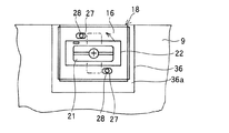 そして、図4に示すような前面枠2に対し、裏側カバー9が閉止され、裏側カバー押さえ止め具21と、回動阻止板38とが凹状段部36の内側へ突出した状態において、図6に示すように、ケース本体18の底壁部材16を裏側カバー9の凹状段部36に向け、裏側カバー押さえ止め具21と、回動阻止板38を底壁部材16の挿通用孔22に挿通させるとともに、裏側カバー9に突設された突起28、28を底壁部材16の孔27、27に遊嵌させ、凹状段部36の底部36aにケース本体18の底壁部材16を当接させる。図7は、裏側カバー9の凹状段部36の底部36aにケース本体18の底壁部材16が当接した状態を示す。そして、支軸29を中心に、裏側カバー押さえ止め具21を反時計方向に回動させ、ケース本体18を裏側カバー9を介して、前面枠2に止着する(図7の2点鎖線参照)。図8は、ケース本体18が裏側カバー9を介して前面枠2止着された状態を示す。