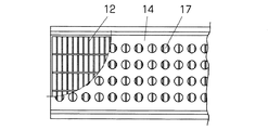 U字ブロック11は、側壁16の上面に蓋掛り用の段差のない上蓋式のブロックで、土圧に耐えるために側壁16の下方部分が肉厚となっている。鋼製格子蓋12は、グレーチングと呼ばれている従来構造で、その下面に縦板がU字ブロック11の上縁内側に嵌り込む断面T型のずれ止め金具13が溶着されている。鋼板14は、スポット溶接などで鋼製格子蓋12に固定された状態で、その上面に覆着されている。舗装層15が透水性舗装であるときは、この鋼板14として図4に一部を示すように、水抜き用の貫通孔17を多数設けた鋼板を用いる。