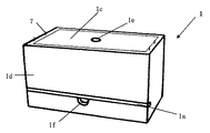箱体1は、和装帯柄を持った表装体2で表装仕立てされている。符号1fは、棚1aを引き出すときに指を掛ける切欠きである。The