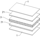 図3に示すように、前記中綿層2は、柔らかさの高い立体構造織物3の上下両側に設けられる化繊綿22を更に含む。