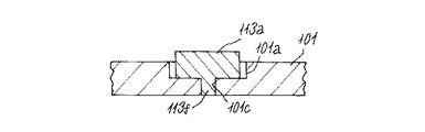 図13に示すように、原稿台本体101の凹部101aの底面には円筒形状の凹部101cが形成されており、これに対応して、弾性摩擦部材113aの底面には下方に突出する円柱状の凸部113fが形成されている。弾性摩擦部材113aは凸部113fを原稿台本体101側の凹部101cに嵌めて係合され、その底面を接着される。この場合にも凸部113fと凹部101cの係合構成によって引き抜き力に対する強度が得られ、接着力と相まってずれや外れを防止できる。他の弾性摩擦部材113においても、また、原稿台本体102側においても同様である。