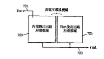 高電圧導通機構110は、この外部電源線102にコンタクト孔(またはバイヤ孔)120aを介して電気的に接続されるフィールド領域120と、内部電源線106に、コンタクト孔(またはバイヤ孔)122aを介して電気的に接続されるフィールド領域122を含む。このフィールド領域120および122は、互いに平行にかつ間をおいて配置される。このフィールド領域120および122の間隔は、約3μm以下とされる(高電圧印加時パンチスルーが生じ、これらのフィールド領域120および122が電気的に接続されやすくするためである)。