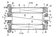 この実施例の発電・電動機は,主として,一対のハウジング部1A,1Bをボルト21で互いに連結して構成されたハウジング1,ハウジング1に一対の軸受13を介して回転可能にそれぞれ支持された回転軸2,回転軸2に固定された永久磁石体3から成る回転子即ちロータ5,及びロータ5の外周でロータ5との間に隙間15を形成してハウジング1に固定されたステータ6を有する。ロータ5は,その一端が回転軸2に設けられたストッパ11に当接し,他端が当て板12を介在して回転軸2のねじ部に螺入された固定ナット16によって回転軸2に固定されている。回転軸2は,例えば,その端部がベルトプーリ等を通じてエンジンの出力軸,又はバイトや砥石に動力伝達装置を介して取り付けられた回転軸に連結されたり,或いは,タービン軸等の回転軸を構成している。ステータ6は,積層された薄板17にステータコイルの銅線7が巻き付けられている。