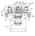 一方、7個の給粉シュート14は、角ダクト状に形成した筒体がそれぞれ用いられていて、対関係にある第1段中継ホッパ13の底口と秤量ホッパ12の頂部側入口との間に亘らせて、図示しないが緩衝材などを介して微振動が可能に水平状に配設されている。この各給粉シュート14の下部には、リニアフィーダ20と振動速度調節手段21とを一体させて形成してなる加振動機構が取付けられていて、リニアフィーダ20を駆動し振動速度調節することにより、各給粉シュート14を長手側の給粉方向に振動させて給粉シュート14に送り込ませる粉末の供給量を増減調節することができるようになっている。なお、図10中の39は、給粉シュート14の中間部に配設した開口量調整用の調整ゲートである。