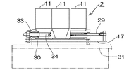 図6は、給粉フィーダ装置2の一部省略示・機能示する平面図、図7は、同じく一部省略示・機能示する正面図である。給粉フィーダ装置2は、7個の給粉ホッパ11と、それらホッパ11を一体に横移動させるアクチュエータとしてのエアシリンダ28と、各ホッパ11に共通させて各底口を一斉に開閉口可能に設けた1枚のシャッタ17と、該シャッタ17を開閉口のために横摺動させるアクチュエータとしてのエアシリンダ29とを備える。